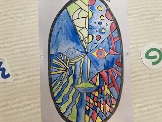 5年生の図工の作品が教室前や児童玄関前に掲示していました。