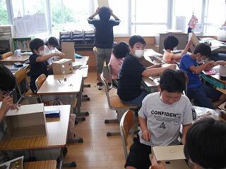 「のぞいて見たら」という学習で、段ボールの箱で光が差し込むように穴を開ける作業をしていました。