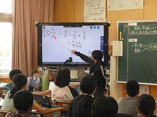 分数の計算で、タブレットに自分の考えを書きこみ、みんなの前で説明していました。