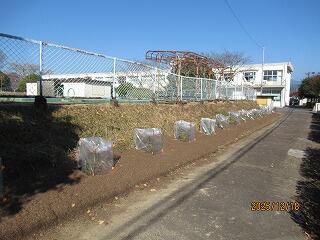 本事業を活用し、本校ではプール横の通路を整備しました。プール横にはニオイバンマツリという樹木の苗を15本植樹しました。この樹木は環境によっては2m以上に成長し、紫と白のきれいな色を咲かせるそうです。今は50cmほどの苗で物足りない感じですが、これから成長すれば学校のシンボルともなるかもしれません。