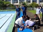 児童は、水着の上に、普段着用する服を着て、水の中に入ります。もぐったり、泳いだりして、着衣の有無でどれだけ体の動きに制限がかかるかを身をもって体験しました。また、ペットボトルを使って、体を浮かせる方法を学びました。他に、ボールや大きいビニール袋なども浮力があることも学びました。水の中でも自分の命を自分で守る方法を学ぶいい時間となりました。