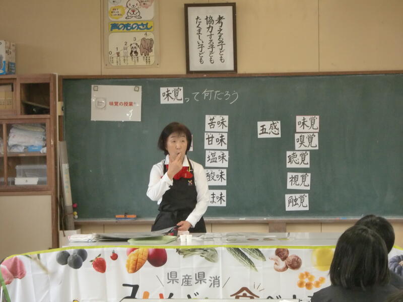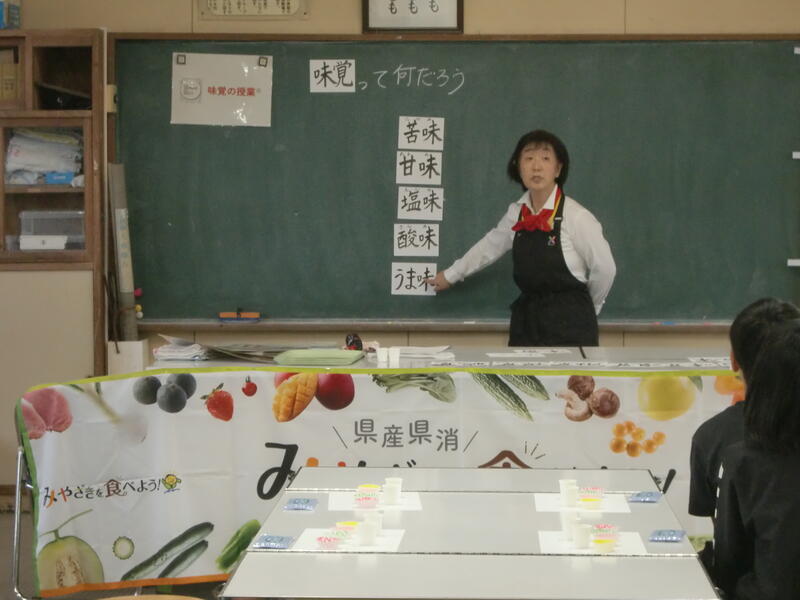 味覚には「苦味」「甘味」「塩味」「酸味」「うま味」の「五味」があることを教えてくださいました。そして、「うま味」は日本でできた「五味」であることも教えてくださいました。子どもたちの反応も良く、興味をもって話を聞いていました。