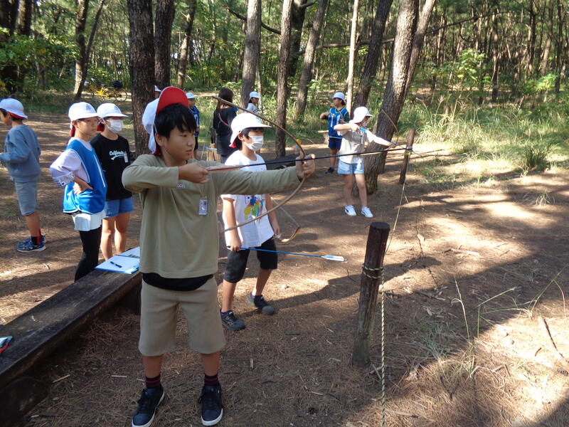 そして、最後の活動「しおかぜ追跡ハイキング」です。3時間近く、班のみんなで協力して様々な問題を解決していく活動です。環境について考えたり、弓矢をしたりを楽しい活動もたくさんです。