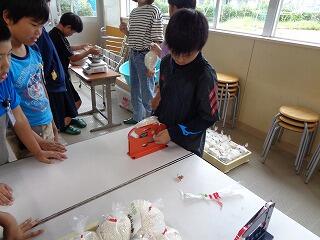 本校では、毎年5年生が実習田で育てたもち米を、PTAバザーで販売しています。今日は、5年生保護者の方々に来て頂いて、1kgずつ袋詰めの作業を行いました。