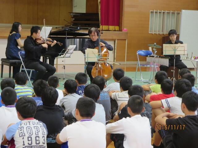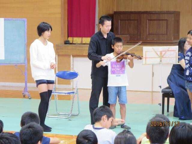 5・6年生が文化庁が実施する音楽に親しむ特別授業を受けました。宮崎市出身のプロの演奏家の手ほどきを受けて弦楽器 の演奏に挑んだり、自作 の演奏に挑んだり、自作の打楽器でリズムを刻んだりしながら、すてき芸術の秋を楽しむことができました。