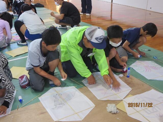 子どもたちが楽しみにしているたこ作りの日です。本年度は、茶臼原小学校と合同で行われました。地域の方や保護者の方と一緒に、午前中はたこ作りを行い、昼は給食を食べました。地域や保護者の方々の優しさに包まれて、思い出に残る一日となりました。