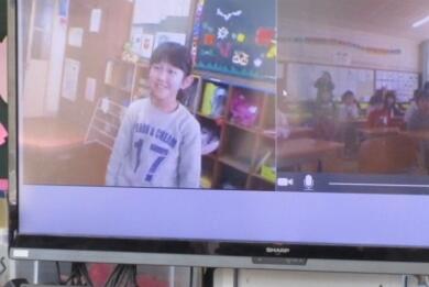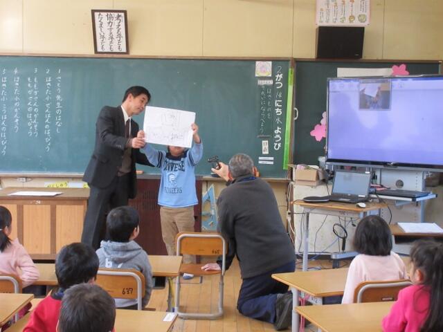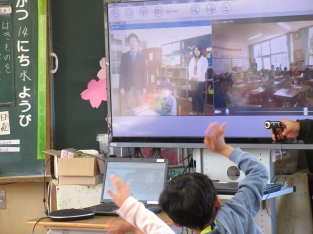 2校時、TV会議システムを使って、西都銀上学園と穂北小をつなぎ、合同授業を行いました。今日は、1年生の国語「じゃんけんやさんをひらこう」です。