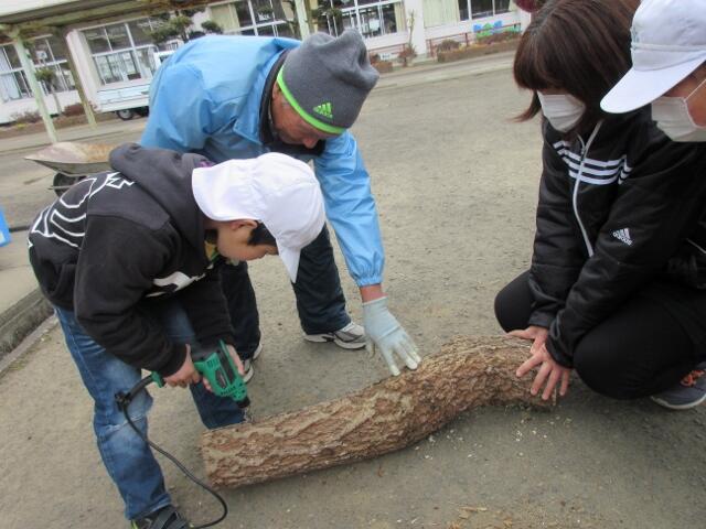 今日、駒打ち(植菌)した原木からしいたけが出てくるのは、来年度の冬休み頃だそうです。楽しみですね。