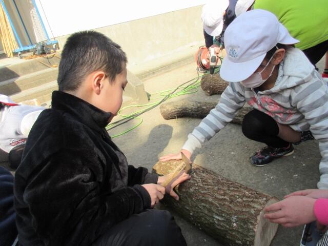 2月9日(金)3校時、穂北づくり協議会のみなさんとしいたけの駒打ち体験をしました。