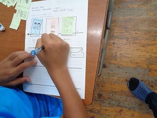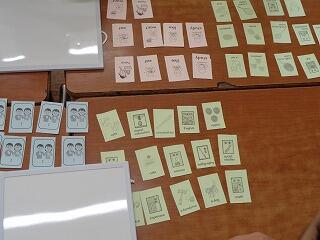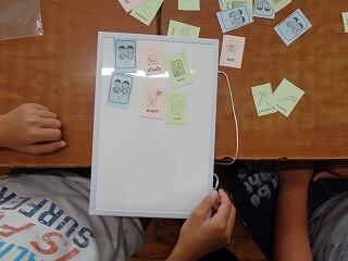 児童は青いカードは主語、ピンクカードは感情や動作を表す言葉、緑のカードは物や教科であると、児童が気付き、「日本語と順番が違う」ということを発表してくれました。
