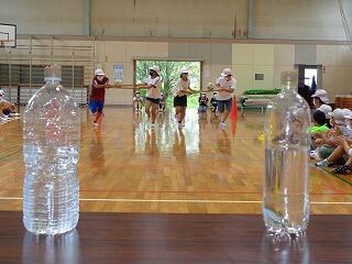 団長、副団長がボールを棒で挟んでペットボトルのとこまで駆けてきます。当然、先に着いたチームがペットボトルを選ぶ権利があります。
