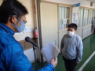 あいさつが良くなったこと。あいさつは、相手に対する思いのほかに自分の存在を知らせるために大切なことをお話しされました。また、冬休みの3つの約束として「1.目標を決める。」「2.家族の一員としてお手伝いを頑張る。」「3.自分の命は自分で守る。」のことを話されました。