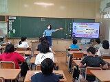 今日は、宮崎北警察署から3名の職員の方とスクールサポーターの桂さんに来ていただき、「非行防止教室」を行いました。