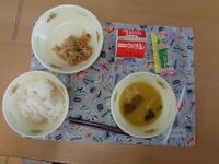 本日のメニューは、「むぎごはん、千切り大根の炒め煮、カボチャの味噌汁、納豆、牛乳」です。
