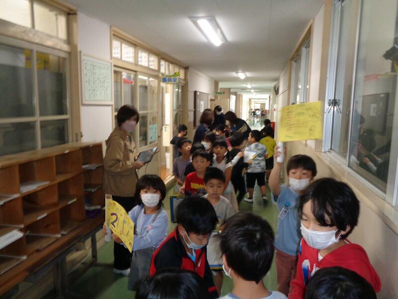 職員室や校長室、事務室、給食室、図書室、保健室を2年生が1年生を引率して「探検」しました。