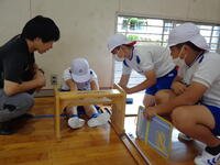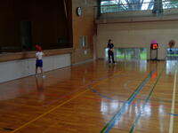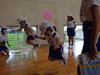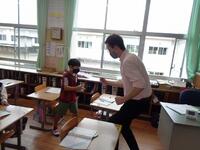 1年生も、6年生のお兄さんお姉さんにお手伝いしてもらいながら体力テストに挑戦しています。今日は雨のため、体育館でのチャレンジです!