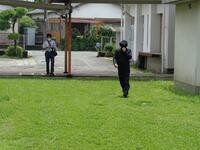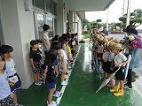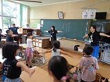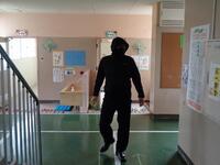 2年生教室に凶器を持った不審者が入ってくるという想定です。事前に、子ども達には不審者が来た場合にはどうのようにすればよいのかなど話をします。
