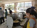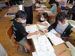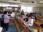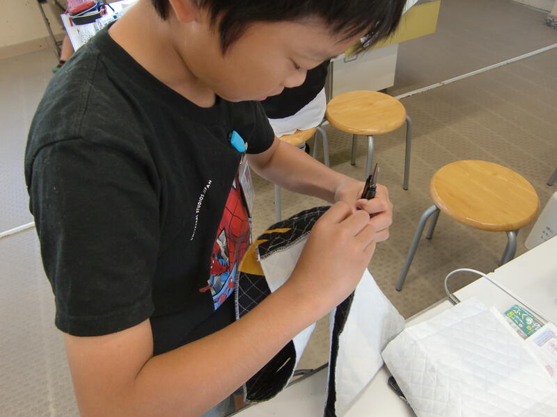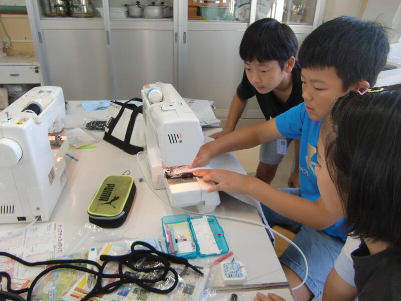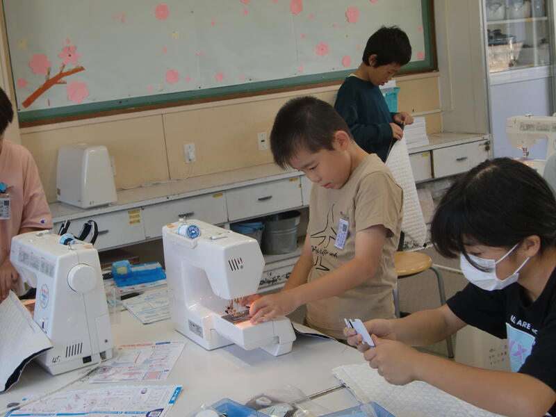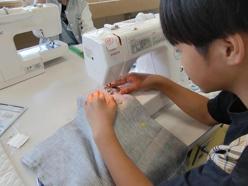 5年生がミシンを使って、ナップザック作りに挑戦しています。ほとんどの子どもたちが、ミシンを扱うのが初めてで、どの児童もものすごく真剣な表情で取り組んでいます。