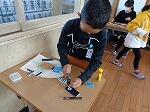 竹ひごを張り付けたり、穴を開けて糸を通したりするのが難しいようでしたが、指導者の方に教わりながら、お家の人と協力して自分だけの凧を作り上げました。