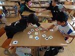 「What`s is this?」と子どもたちが聞くと、担任が「Green.Diamond.」と答え、それに合ったカードを素早く取ります。