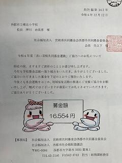 今月初旬に「歳末助け合い運動(赤い羽根共同募金)」を行いました。その際に集まった金額が、「16,554円」であったという連絡を社会福祉協議会から正式にいただきました。穂北小学校のやさしい気持ちが、福祉のために使われることを想像すると、とてもうれしくなります。