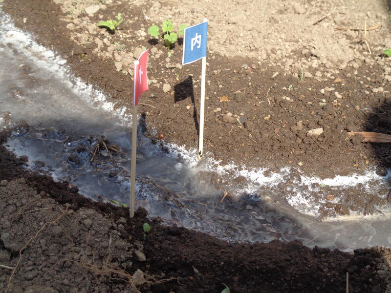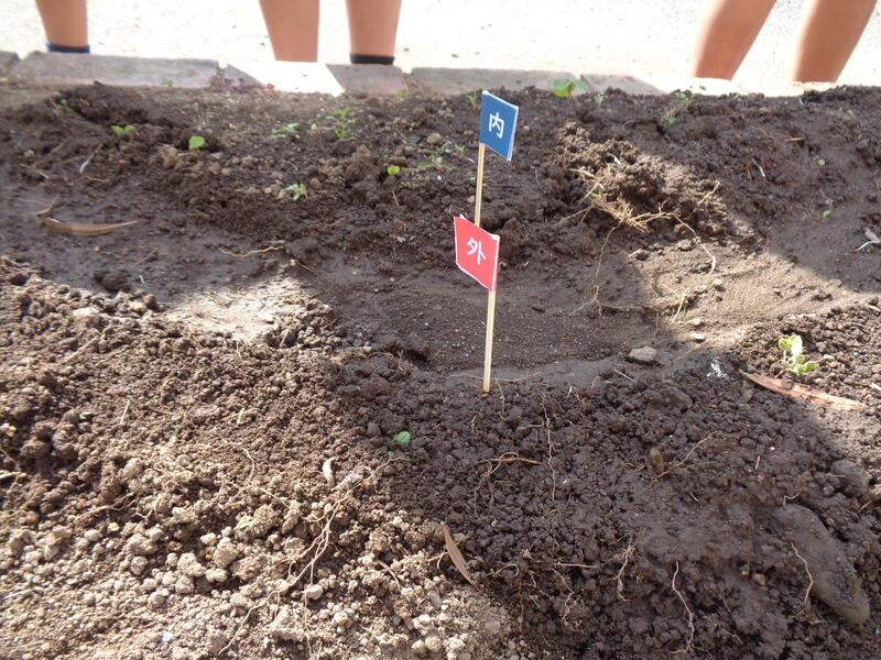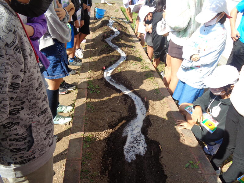 教頭先生が花壇を利用して、実験用の川を作りました。子どもたちは水の流れを見ながらカーブの外側や内側の流れの速さや勢いについて話し合いました。
