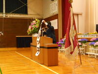 「児童代表のことば」では、5年生の児童が2学期の振り返りと3学期にがんばりたいことを発表しました。4月には下級生のお手本となる6年生になれるよう、3学期の生活をがんばりたいと伝えました。