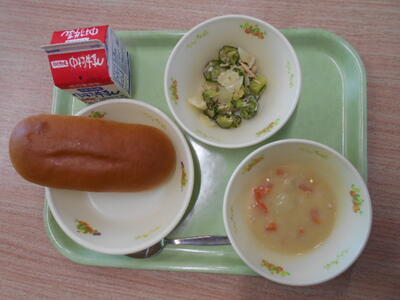 今日のメニューは、黒糖パン、シチュー、サラダ、牛乳でした。