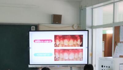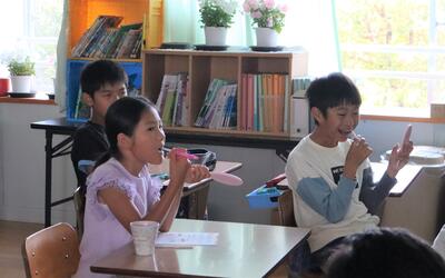 DVD視聴後、実際に歯を磨きました。先月(5月26日の日曜参観日)、学校保健委員会において、親子で「家庭でできる予防歯科」を勉強したこともあり、丁寧に歯を磨いていました。