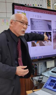 本校の子どもたちの学びを見ていただきました。どの子どもも素敵な表情で学習に取り組んでいるのが非常によいとお褒めの言葉をいただきました。分からない時は友だちを頼るということがきちんとできていて、しかも、頼られた方もきちんと丁寧に説明ができている。互恵的な学びができていると言っていただきました。あとは、教師側が子供たちどうし聞き合える仕掛けをもっともっと作ることが大事と言われました。