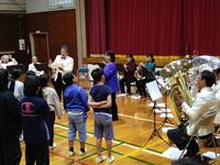 後半は、鑑賞教室ということで、宮崎アカデミックブラスアンサンブルという金管楽器のメンバーの演奏会を聞きました。日常の生活で、本物の金管楽器を見て、そしてその音色を聞くことがなかった子どもたちです。