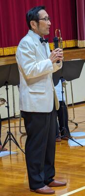 写真は、寄贈されたトランペットとそのお話をしていただいた井手茂貴先生です。