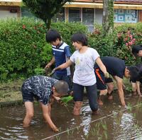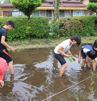 5・6年生合同で田植えを行いました。JA西都の井上さん、浜砂さんに来ていただき、ご指導を受けました。前日までの大雨が嘘のように収まり、薄曇り最高の田植え日和とまりました。