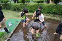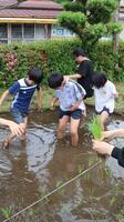 はじめのうちは田んぼに入るのを躊躇していた子どもも、次第に粘土のぬるぬるの感触が気に入ったのか、大はしゃぎで稲を植えていました。1時間以上かかると思われていた作業も、30分足らずで終えることができました。最後に「バッチリ米を育てます。」と約束して、すべての作業を終わりました。