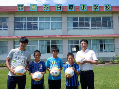 小川真輝選手とホームタウン担当の落合夏樹様が来校され、サッカーボール5個をいただきました。