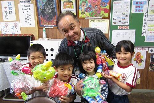 1年生が図工の作品をもって校長室にやってきました。「ひかりのくにのおともだち」というテーマの作品です。それぞれが工夫を凝らした、ぴかぴか光るかわいい作品です。