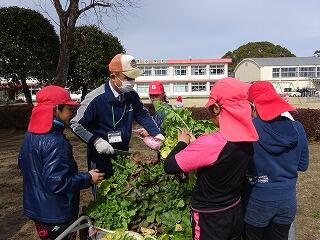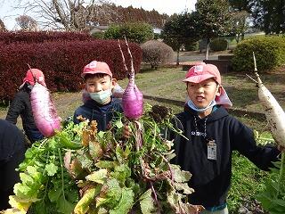 昼休み時間、おにぎり山横の畑で育てていた「米良大根」の収穫をしました。今年は種をまくのが遅くなり、株が十分に成長する前に寒さが来てしまったので、例年よりは小ぶりな大根となりましたが、紫色や白色の太い大根が顔を出すと、子ども達はとてもうれしそうでした。