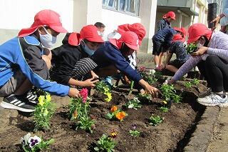 3週間前から植え替えの準備や土の手入れをしていた花壇に、全校児童で花の苗を植えました。環境美化委員会の児童が花に関するクイズを出して盛り上げた後に、担当の先生から植え方や手入れの仕方の注意を聴き、5種類の花の苗を植えました。これからみんなで世話をして、花いっぱいの茶臼原小にしていきます。