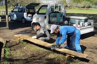 先日保護者の方に取り付けていただいた運動場のベンチですが、今日は午前中から保護者の方々が2名みえて、表面の仕上げ作業をしてくださいました。工具を使ってベンチの表面を丁寧に磨いていいただきました。防腐剤も塗ってくださるそうです。