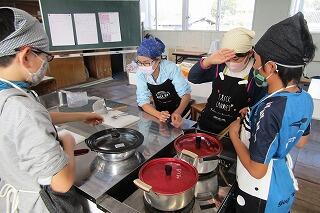 学校の廊下にとてもいい匂いがします。その匂いをたどっていくと、家庭科室で6年生が調理理実習をしていました。夕食のおかずをつくることを目標に、自分たちで栄養のバランスやいろどりを考えて料理を作っていました。