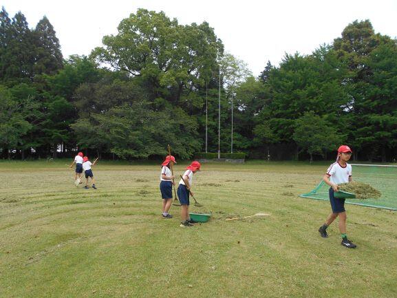 全校児童一斉にスポーツテストを実施しました。次の種目を待つ間に、運動場の整備にも一生懸命に取り組んでいます。