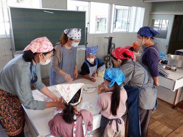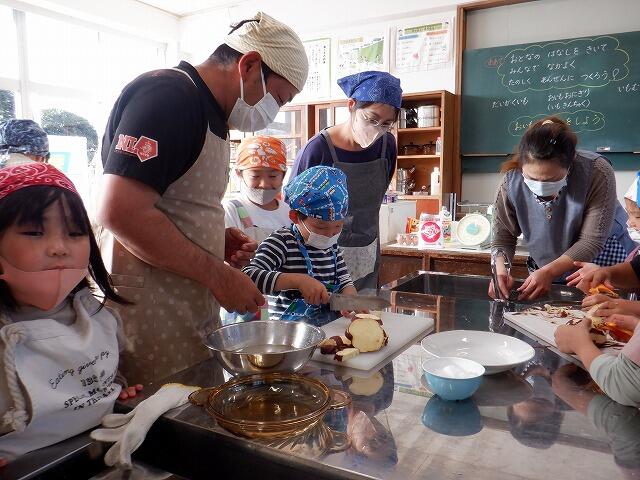 今日は、先日収穫した『サツマイモ』を使った調理をメインに『収穫祭』を実施しました。3つのグループで「イモ蒸しパン」「大学いも」「おいもにぎり」を分担し、保護者の方々の御協力を得ながら楽しく活動することができました。イモ栽培の指導をしてくださった「沖田さんご夫婦」も参加し、子ども達の活動を6名のの保護者と2名の担任でサポートしながら手際よく調理することができました。