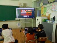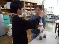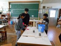 その先の理科室では、6年生が「地層」の勉強中でした。こちらは、アナログで実験中です。