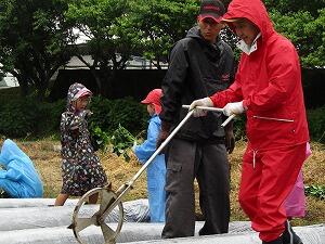 今年も学校の畑にいもを植える日がきました。何日も前から保護者の方が畑を耕し、畝をつくり、ビニールを張るなどの準備をしてくださっていました。
