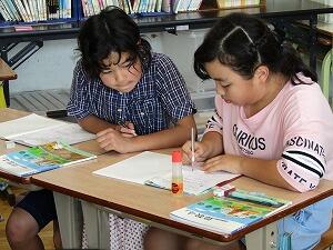 教室をのぞいてみると、1・2年生が合同で図工の学習をしていました。森から拾ってきた松ぼっくりに色を塗り、それを木の枝などと組み合わせた作品を作るのだそうです。2年生が1年生に作り方をやさしく教えていました。