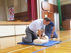 5月29日(水)西都消防署の方を講師に招いて、職員向けの心肺蘇生法講習会を開催しました。水泳指導が始まる前に毎年実施しています。消防署の方の説明や実演の後、全職員が実際に胸骨圧迫や人工呼吸及びAEDの使い方を学びました。子どもの命を預かる学校職員として真剣に取り組んでいました。