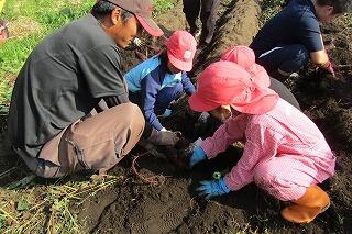 秋のさわやかな空の下、1~3年生がいもほりをしました。学校の畑で5月から育てていたおいもです。土の中から次と次と顔を出す大きないもを、力いっぱい引っ張ってほり出していました。一輪車6台分と予想以上にたくさんとれたので、全校の子ども達や先生たちに配って回る子ども達の顔はとても誇らしげでした。