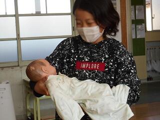 子ども達は、実際の赤ちゃんとほぼ同じ重さの人形を抱っこしてみました。