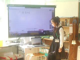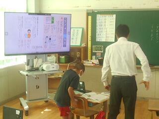 2年生は算数の授業です。タブレットも黒板も上手に活用しています。