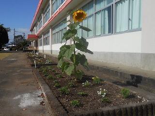 これから、だんだんときれいな花が咲いてきます。先月まで咲き誇っていたミニひまわりの中に、1本だけ大きなひまわりがありました。そのひまわりだけを残していましたが、この寒さの中、大輪を咲かせました!!